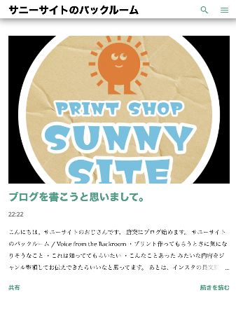 ブログ始めました。 「サニーサイトのバックルーム」https://blog.sunnysite.jp/ プリントって身近なようでも案外知られていないことが多いと思うので、何かしら役立つ知識、使ってる機材や資材なんかを気長にお伝えできたらなと思っています。 |